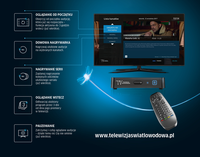 Możesz nagrywać, przewijać i zatrzymywać swoje ulubione programy - dzięki usłudze domowej nagrywarki. Możesz też obejrzeć swoje ulubione audycje nawet 3 dni do tyłu. Wszystko jest możliwe dzięki naszemu nowoczesnemu, zaawansowanemu technologicznie dekoderowi.